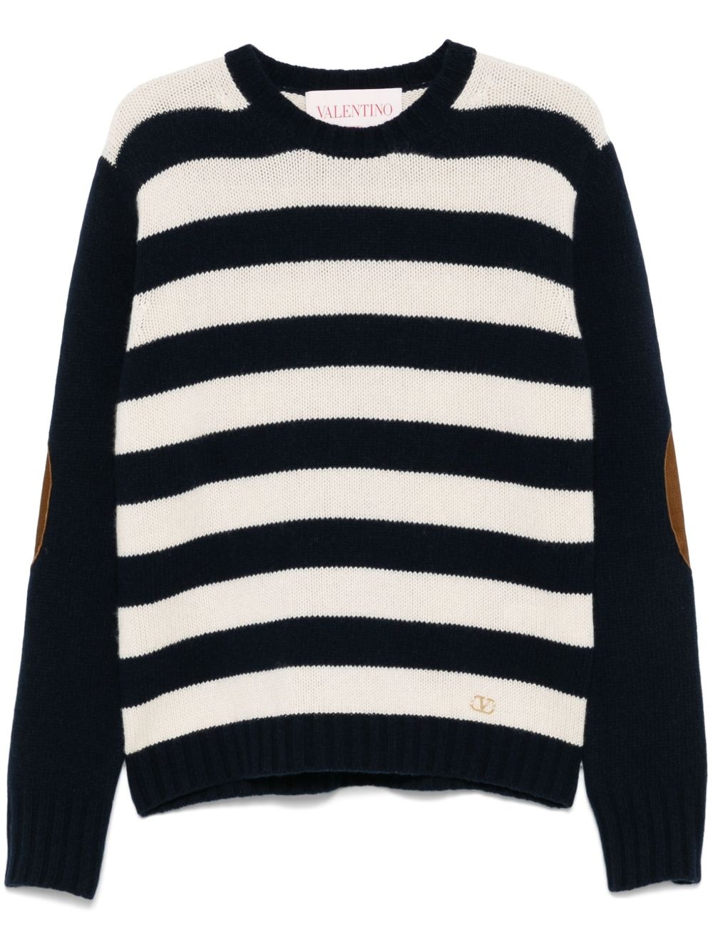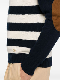striped sweater Highlights - Navy blue - Crew neck - Elbow patches - Ribbed trim Made in Italy Composition Virgin Wool 100%, Lamb Skin 100%, Wool 50%, Cashmere 50% SIZE & FIT Model measurements Height 6 ft 2 in(1.87 m) Bust/Chest 36.41 in(92.5 cm) Hips 35.43 in(90 cm) Waist 29.52 in(75 cm) FittingInformation Designed for a relaxed fit, this piece allows for comfort and movement when worn Made with a midweight knit, this piece offers some stretch
