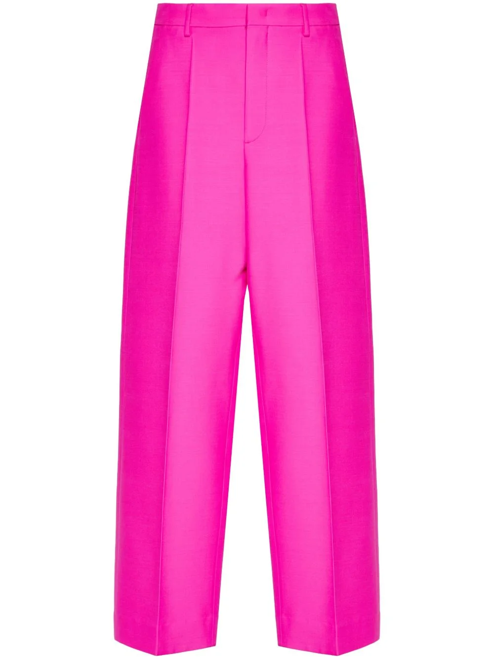 Crepe Couture tailored trousers In true Valentino Garavani style, a classic silhouette is enhanced with a dramatic appeal. Presented in a vibrant colourway that is the signature of their Pink PP collection, these tailored trousers fall to an extra long length which contributes to their bold appearance. Highlights - Valentino ready to wear - Pink pp - Virgin wool - Pressed crease - High waist - Belt loops - Concealed fly and button fastening - Straight leg - Extra-long length - Slip pockets to the sides - The full look includes valentino garavani accessories. Made in Italy Composition Lining: Viscose 100%, Cupro 100% Outer: Virgin Wool 65%, Silk 35% SIZE & FIT Measurement FRONT RISE 13.5 in(34.3 cm) INSIDE LEG 35 in(88.9 cm) BACK RISE 17 in(43.2 cm) HIPS 39.01 in(99.1 cm) Hem Width 20.98 in(53.3 cm) WAIST 32.99 in(83.8 cm) Washing instructions Read Manufacturer Guidelines