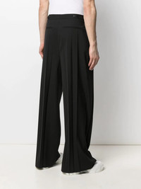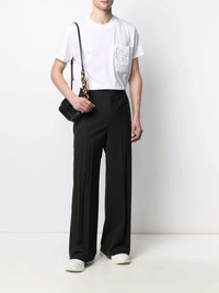 tailored wide-leg trousers When they talk about relaxed tailoring, this is what they mean. Valentino Garavani's black tailored trousers go supersize thanks to a wide-leg fit. Go large. Highlights - Valentino ready to wear - Black - Pleat detailing - Pressed crease - Wide leg - Concealed front fastening - Two side slit pockets - Two rear welt pockets Made in Italy Composition Outer: Polyester 53%, Virgin Wool 43%, Elastane 4% Lining: Cotton 100% SIZE & FIT Model measurements Height 6 ft 2 in(1.87 m) Bust/Chest 37.79 in(96 cm) Hips 37.79 in(96 cm) Waist 30.31 in(77 cm) Measurement FRONT RISE 14.17 in(36 cm) INSIDE LEG 30.31 in(77 cm) Hem Width 9.44 in(24 cm) WAIST 33.07 in(84 cm) FittingInformation This piece fits true to size. We recommend you get your regular size Designed for a slim fit at the waist and loose over the leg Made with a mid-weight non-stretch fabric Washing instructions Read Manufacturer Guidelines