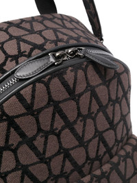 Toile Iconographe leather-trim backpack Valentino Garavani's Toile Iconographe - a hypnotic take on the VLogo Signature - takes centre stage for SS23. Rendered here in black against the brown backdrop, it lends this backpack a particularly bold aesthetic. Highlights - Brown - Black - Cotton - Vlogo signature - Logo-embellished lining - Gold-tone hardware - Leather trim - Single top handle - Two adjustable shoulder straps - Main compartment - Front zip-fastening pocket Made in Italy Composition Outer: Cotton 100% SIZE & FIT Model measurements Height 6 ft 2 in(1.88 m) Bust/Chest 36.61 in(93 cm) Hips 35.82 in(91 cm) Waist 27.95 in(71 cm) Measurement DEPTH 9.05 in(23 cm) HEIGHT 15.74 in(40 cm) WIDTH 11.81 in(30 cm)