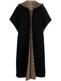 Toile Iconographe reversible coat Cut from a soft virgin wool blend, Valentino Garavani's reversible coat transforms from a black colourway to the signature Toile Iconographe design — a repetitive iteration of the house's iconic VLogo. A classic hood completes the oversized silhouette. Highlights - Valentino ready to wear - Black/beige - Virgin wool blend - Reversible - All-over logo print - Classic hood - Front button fastening - Short draped sleeves - Side slits - The full look includes valentino garavani accessories. Made in Italy Composition Virgin Wool 99%, Silk 1% SIZE & FIT Model measurements Height 5 ft 10 in(1.78 m) Bust/Chest 30.7 in(78 cm) Hips 36.22 in(92 cm) Waist 25.59 in(65 cm) FittingInformation Designed to be unstructured, offering a loose fit throughout Made from a midweight non-stretch fabric This piece fits true to size – take your usual size Washing instructions Dry Clean Only