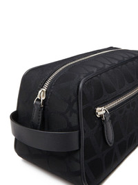 Iconographe wash bag The Black Iconographe pattern - a reinterpretation of the house's VLogo Signature - takes centre stage in Valentino Garavani's AW23 collection. This wash bag showcases the new motif in a classic black colourway. Highlights - Black - Cotton - Calf leather - Vlogo signature - Top zip fastening - Front zip-fastening pocket - Main compartment Made in Italy Composition Outer: Calf Leather 100%, Metal 100%, Polyester 68%, Cotton 32% Lining: Polyester 100%, Calf Leather 100% SIZE & FIT Measurement DEPTH 4.33 in(11 cm) HEIGHT 5.51 in(14 cm) WIDTH 9.84 in(25 cm) Washing instructions Read Manufacturer Guidelines