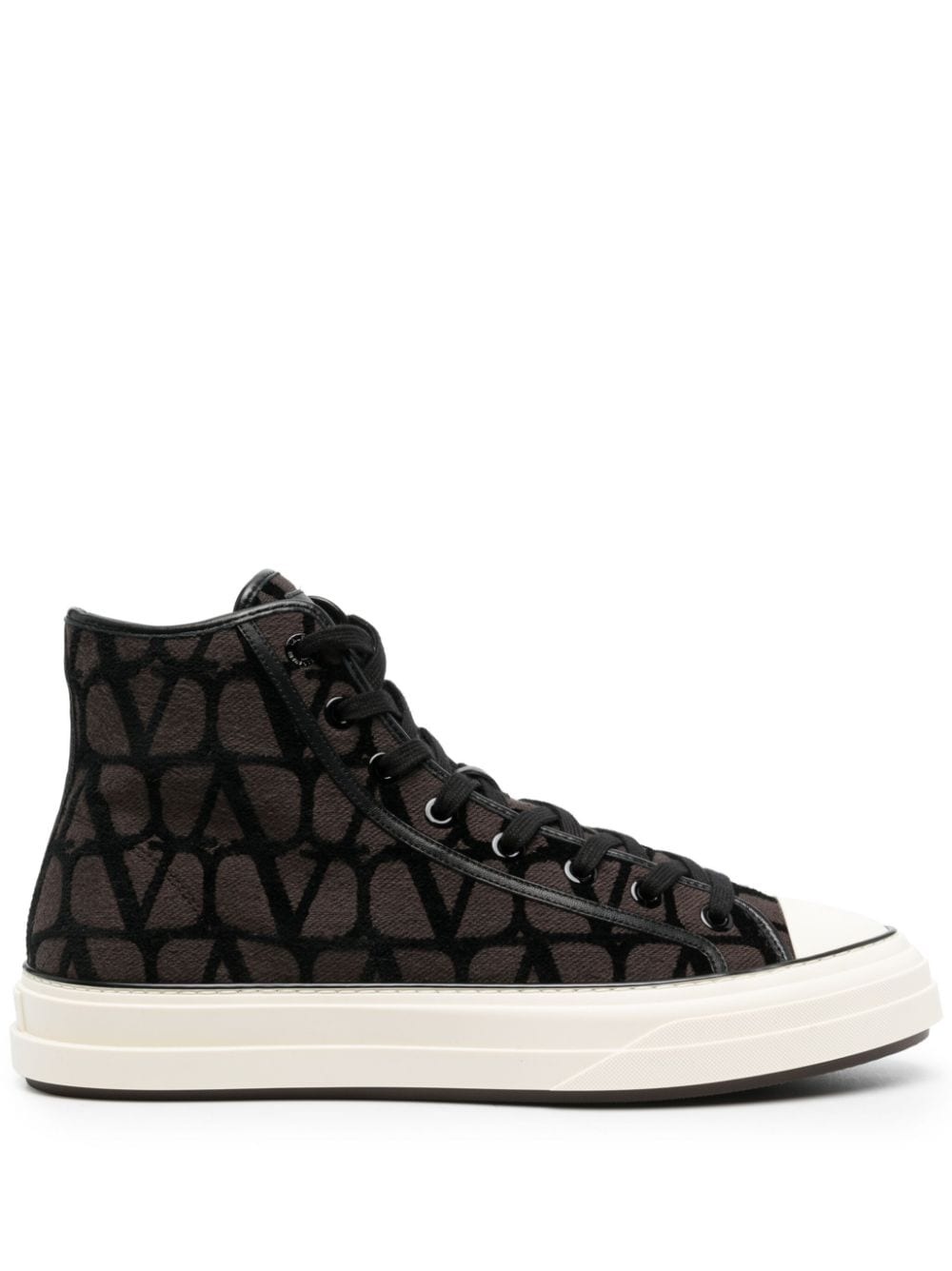 Tootaloop logo-print hi-top sneakers These Tootaloop high-top trainers by Valentino are crafted in Italy to a relaxed silhouette with an upper that's patterned in the brand's iconographe print. A rubber sole and reinforced toe cap emphasise the sporty style. Highlights - Black - Cotton - All-over logo print - Logo patch at the tongue - Round toe - Front lace-up fastening - Flat rubber sole Made in Italy Composition Outer: Lambskin 100%, Viscose 37%, Cotton 32%, Polyester 31% Lining: Cotton 100%, Leather 100%, Goat Skin 100% Sole: Rubber 100% SIZE & FIT Measurement CIRCUMFERENCE 11.02 in(28 cm) HEEL 1.45 in(3.7 cm) HEIGHT 4.92 in(12.5 cm) Sole height 1.45 in(3.7 cm)