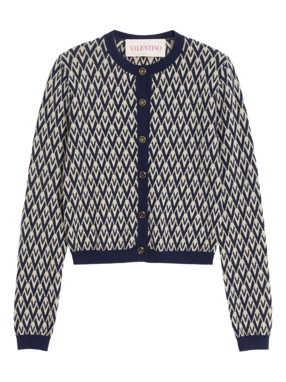 Toute La V jacquard cardigan Highlights - Navy blue and beige - Virgin wool - Button-fastening - Logo-detailed buttons - Crew-neck - Long-sleeves - Contrasting trim - Pattern Made in Italy Composition Virgin Wool 100% SIZE & FIT FittingInformation Designed for a slim fit that sits just away from the body offering a close yet comfortable fit Made with a midweight knit, this piece offers some stretch