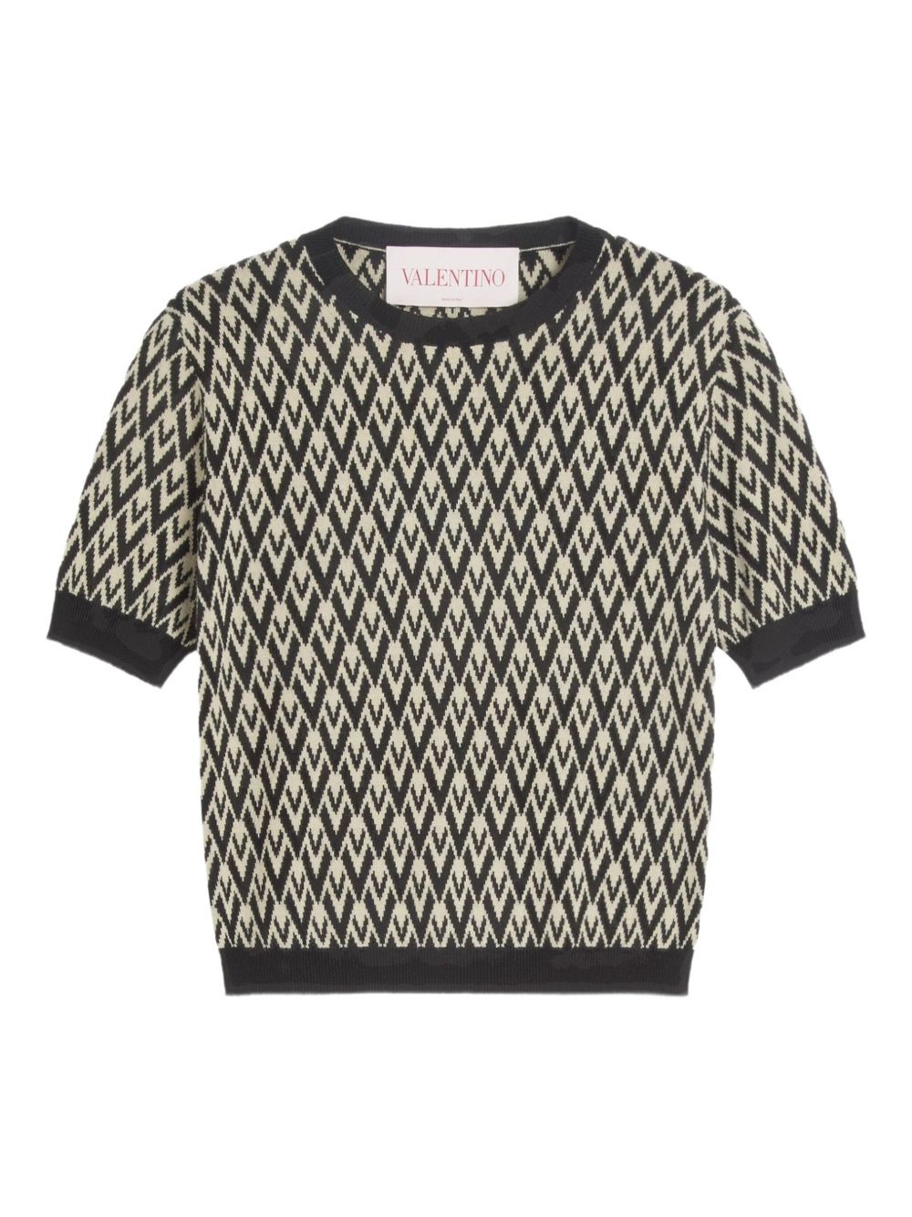 geometric-pattern T-shirt Highlights - Beige/black - Virgin wool - Crew neck - Short sleeves - Ribbed cuffs and hem - Contrasting trim - Geometric pattern Made in Italy Composition Virgin Wool 100% Washing instructions Read Manufacturer Guidelines