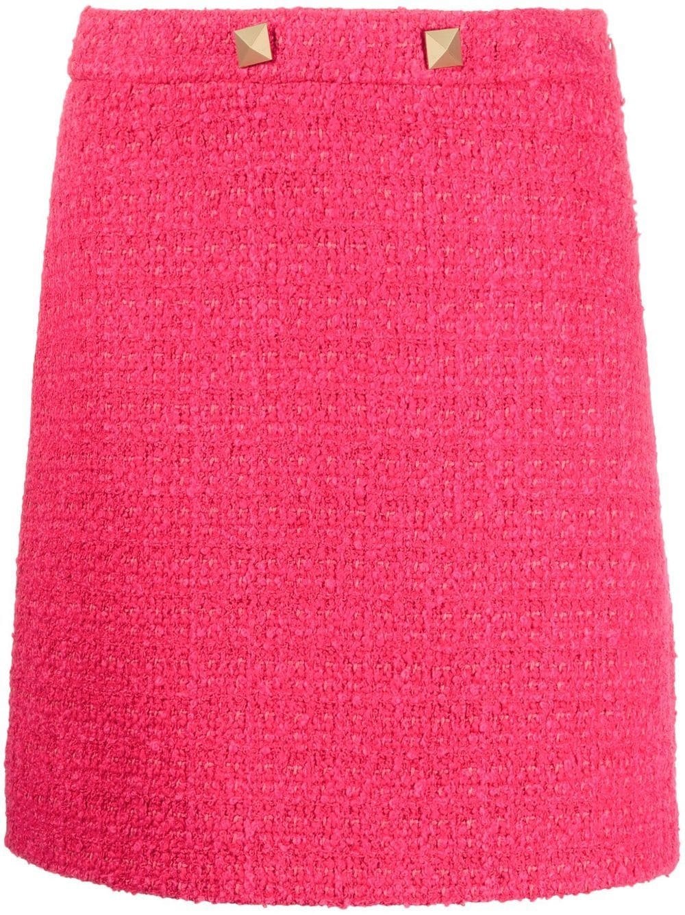 tweed mini skirt Valentino Garavani adds its signature touch to this tweed mini skirt, creating a sophisticated style. Presented in a pink hue, this design is detailed with the label's Rockstud embellishment for a branded finish. Highlights - Valentino ready to wear - Pink - Wool blend - Tweed - Gold-tone rockstud detailing - High-waisted Made in Italy Composition Outer: Cotton 31%, Acrylic 29%, Viscose 18%, Wool 15%, Polyester 6% Lining: Viscose 63%, Silk 37% SIZE & FIT Model measurements Height 5 ft 10 in(1.77 m) Bust/Chest 32.67 in(83 cm) Hips 35.43 in(90 cm) Waist 23.62 in(60 cm) FittingInformation This piece fits true to size. We recommend you get your regular size Designed to be fitted at the waist and hips, loose over the leg Made with a mid-weight non-stretch fabric Washing instructions Dry Clean Only