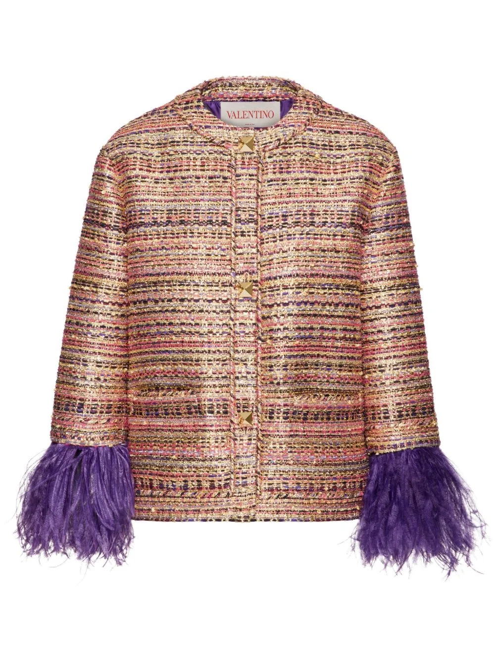 Tweed Party feather-trim jacket Woven with shimmering metallic threads, this Valentino Garavani jacket embodies the house's penchant for eye-catching patterns. It's defined by variegated horizontal stripes in lustrous hues of gold, pink and purple. Highlights - Valentino ready to wear - Pink/gold/multicolour - Metallic threading - Abstract pattern - Feather-trim detailing - Gold-tone rockstud detailing - Round neck - Front button fastening - Long sleeves - Straight hem - The full look includes valentino garavani accessories. Made in Italy Composition Outer: Ostrich Feather 100%, Polyamide 42%, Polyester 19%, Metallic Fibre 18%, Cotton 8%, Cupro 6%, Acrylic 4%, Wool 2%, Viscose 1% Lining: Silk 100% Washing instructions Read Manufacturer Guidelines