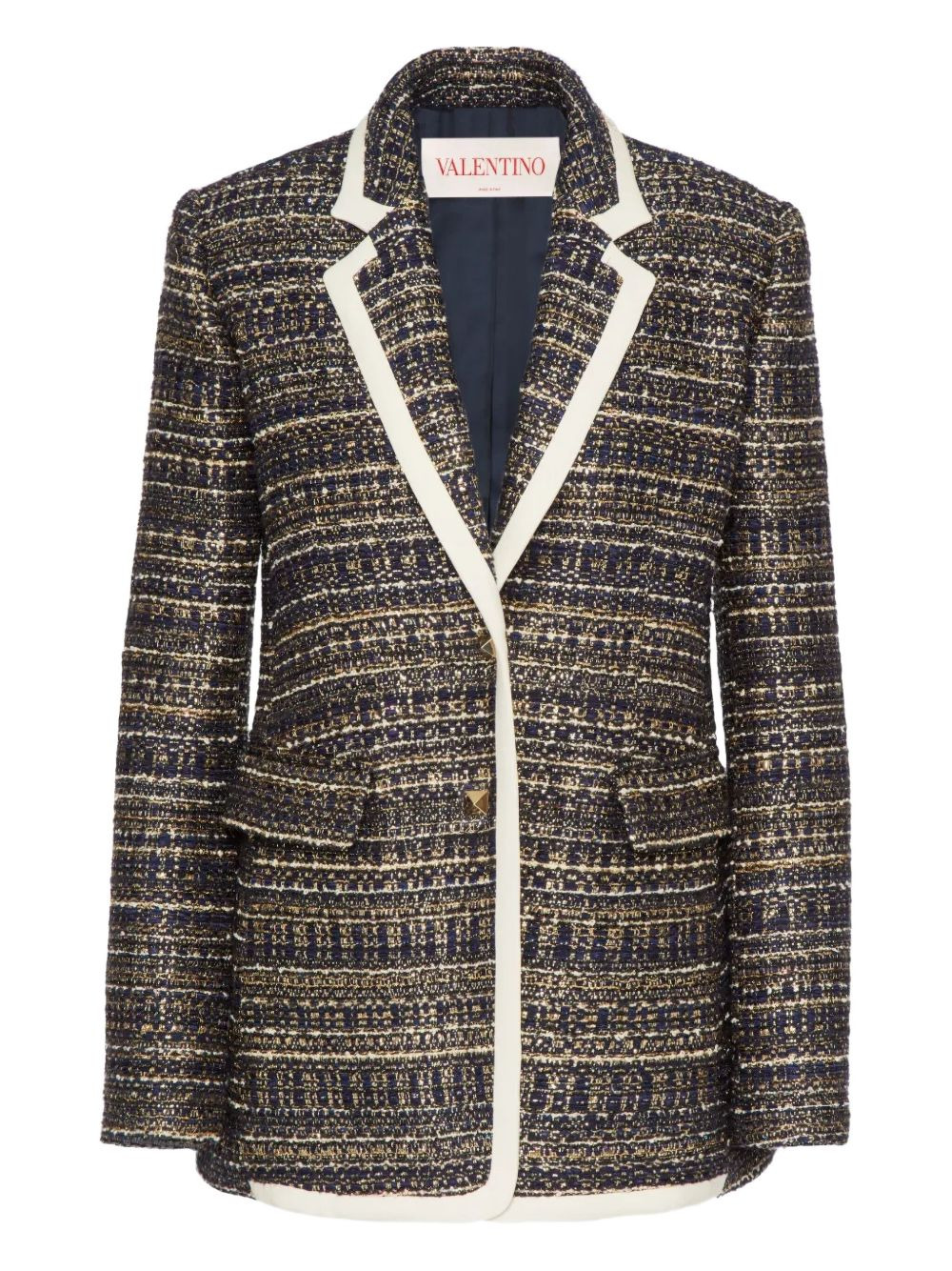 Tweed Party single-breasted blazer Valentino Garavani’s blazer is an ornate take on classic tailoring. Crafted from tweed woven with metallic threads, the single-breasted silhouette is adorned with signature gold-tone Roman Stud buttons. Highlights - Valentino ready to wear - Navy blue/gold-tone/ivory white - Virgin wool blend - Tweed - Contrasting border - Notched lapels - Shoulder pads - Front button fastening - Long sleeves - Two side flap pockets - Straight hem - The full look includes valentino garavani accessories. Made in Italy Composition Outer: Virgin Wool 65%, Silk 35% Lining: Cupro 100%