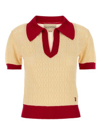 two-tone knitted polo shirt Highlights - Pale yellow - Red trim - Short sleeves - V-neck - Cable knit Made in Italy Composition Linen/Flax 54%, Viscose 46% Washing instructions Read Manufacturer Guidelines