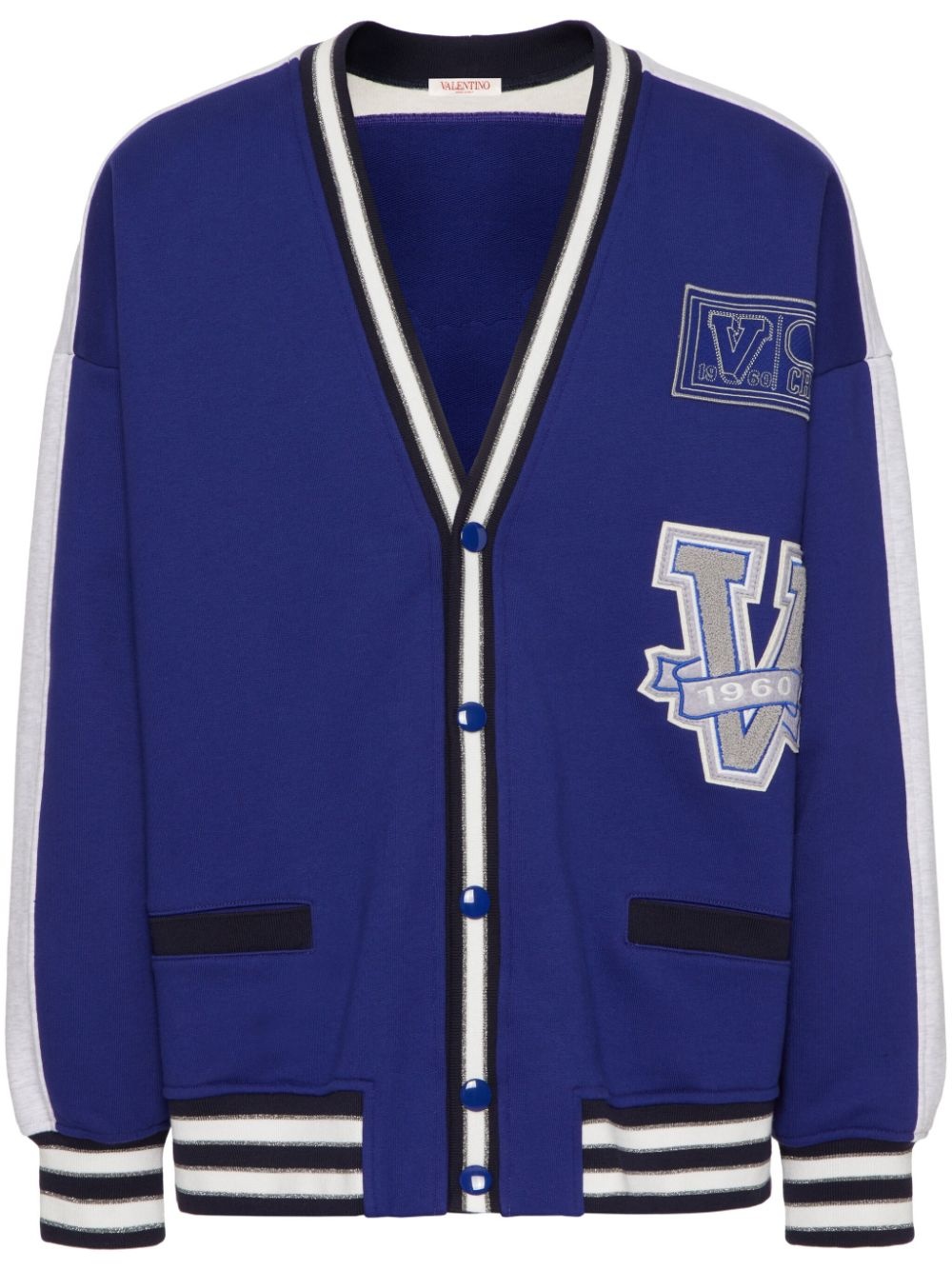 V Crew patches V-neck cardigan Valentino Garavani takes a sporty approach to design for SS23 with this V-neck cardigan, adorned with varsity patches all-over. The blue-hued garment is finished with a contrasting striped trim. Highlights - Valentino ready to wear - Cobalt blue - Black/white - Logo patches to the front - Logo patch to the rear - Stripe trim - V-neck - Long sleeves - Front button fastening - Straight hem - The full look includes valentino garavani accessories. Made in Italy Composition Outer: Cotton 100% Washing instructions Read Manufacturer Guidelines