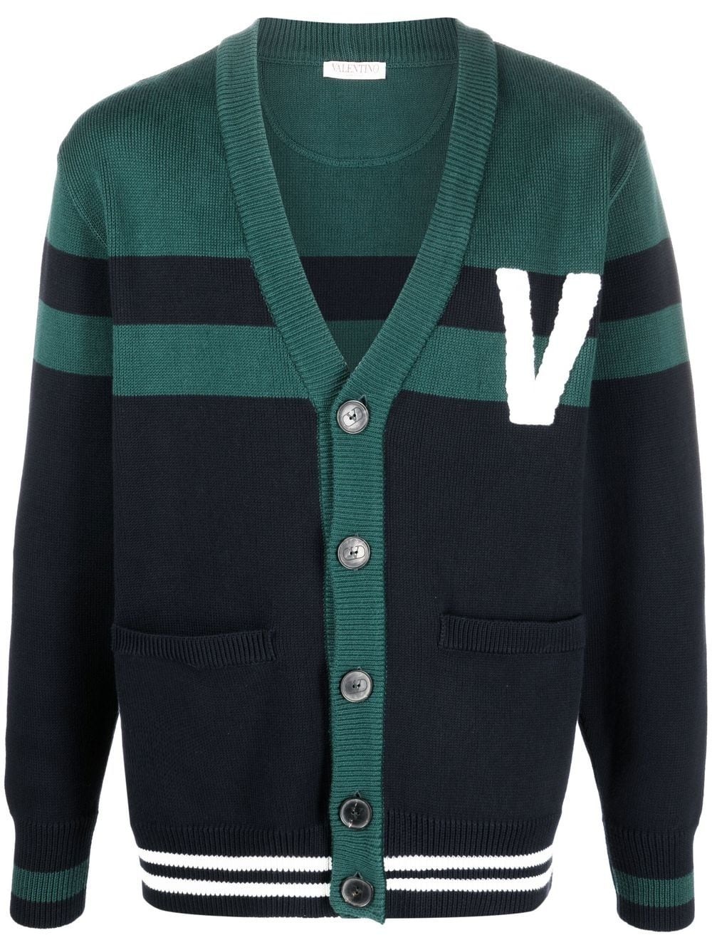 V-logo knitted cardigan Valentino Garavani is known for presenting designs that are infused with signature stamps of approval. This knitted cardigan is a fine example, finished with a contrasting V-logo intarsia knit across the chest. Highlights - Valentino ready to wear - Emerald green/navy blue/white - Cotton - Logo print at the chest - Horizontal stripe pattern - Knitted construction - V-neck - Front button fastening - Long sleeves - Ribbed-knit edge Made in Italy Composition Cotton 100% SIZE & FIT Model measurements Height 6 ft 2 in(1.88 m) Bust/Chest 35.43 in(90 cm) Hips 36.61 in(93 cm) Waist 27.95 in(71 cm) FittingInformation This piece fits true to size. We recommend you get your regular size Cut for a relaxed fit Made with a mid-weight fabric Washing instructions Read Manufacturer Guidelines