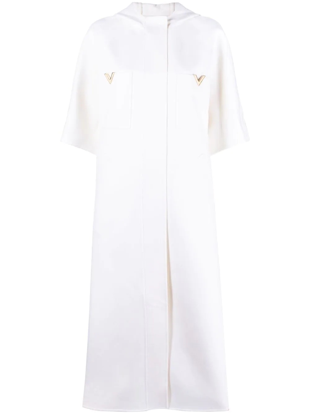 VGold hooded cape Italian-made, Valentino Garavani's AW22 collection includes this hooded oversized cape coat, presented in a virgin wool and cashmere blend construction. The design's white hue is punctuated by two VGold logo plaques on the front. Highlights - Valentino ready to wear - White - Virgin wool-cashmere blend - Vgold detail - Classic hood - Concealed front fastening - Three-quarter length sleeves - Two chest patch pockets - Two side slit pockets - Curved hem - Long length Made in Italy Composition Lining: Viscose 100% Outer: Virgin Wool 90%, Cashmere 10% SIZE & FIT Model measurements Height 5 ft 10 in(1.78 m) Bust/Chest 30.31 in(77 cm) Hips 36.61 in(93 cm) Waist 24.8 in(63 cm) FittingInformation This piece fits true to size. We recommend you get your regular size Cut for a loose fit Made with a mid-weight non-stretch fabric Washing instructions Read Manufacturer Guidelines