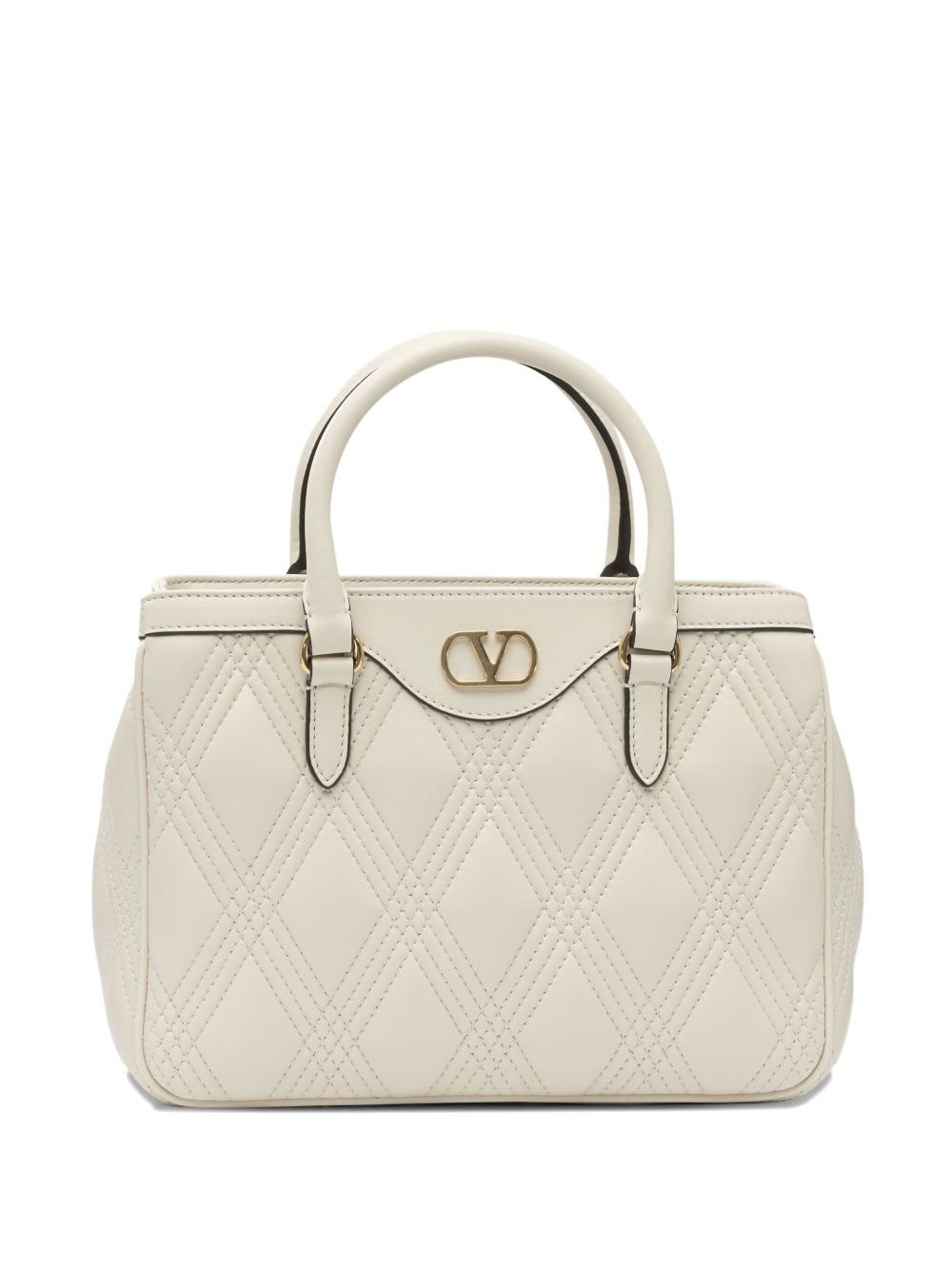 v-logo quilted shoulder bag Highlights - Off-white - Diamond quilting - Top handles - Detachable shoulder strap - V-logo emblem - Open compartments Made in Italy Composition Lamb Skin 100% SIZE & FIT Measurement DEPTH 3.54 in(9 cm) HEIGHT 5.9 in(15 cm) WIDTH 9.84 in(25 cm)