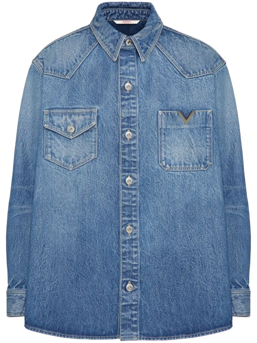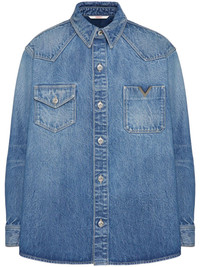 V-detail denim shirt Highlights - Valentino ready to wear - Indigo blue - Cotton - Denim - Panelled design - Signature v logo plaque - Contrast stitching - Classic collar - Front button fastening - Long sleeves - Buttoned cuffs - Two chest patch pockets - Straight hem Made in Italy Composition Cotton 100% SIZE & FIT Measurement CHEST 49.6 in(126 cm) SLEEVE LENGTH 24.8 in(63 cm) WAIST 49.6 in(126 cm)
