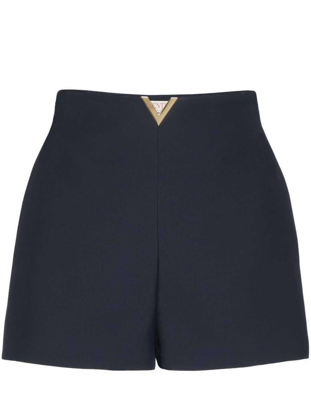 Crepe Couture tailored shorts Valentino Garavani's penchant for subtly branding its pieces is what makes these shorts a must-have for AW23. Spun from a navy blue virgin wool and silk blend, they boast the signature VGold plaque right at the centre, adding a slight cut-out detail at the waistline. Highlights - Valentino ready to wear - Navy blue - Virgin wool-silk blend - Vgold detail - Concealed side zip fastening - Thigh-length - The full look includes valentino garavani accessories. Made in Italy Composition Outer: Virgin Wool 65%, Silk 35% Lining: Silk 100% SIZE & FIT Measurement FRONT RISE 12.79 in(32.5 cm) HIPS 33.85 in(86 cm) WAIST 23.62 in(60 cm) Washing instructions Read Manufacturer Guidelines