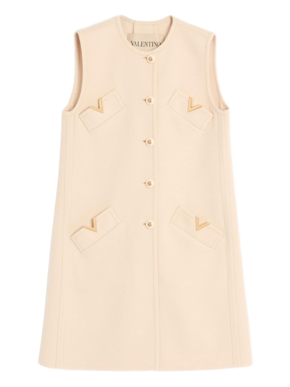 VGOLD button-up coat Highlights - Valentino ready to wear - Beige - Vgold detail - Front button closure - Sleeveless - Straight hem Made in Italy Composition Outer: Wool 90%, Cashmere 10% Washing instructions Read Manufacturer Guidelines