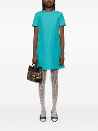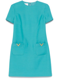 VGold mini dress Highlights - Valentino ready to wear - Aqua blue - Concealed rear hook and zip fastening - Crew neck - Two front patch pockets Made in Italy Composition Outer: Virgin Wool 65%, Silk 35% Lining: Silk 100%, Polyester 100% SIZE & FIT Model measurements Height 5 ft 11 in(1.8 m) Bust/Chest 32.67 in(83 cm) Hips 36.22 in(92 cm) Waist 24.4 in(62 cm) FittingInformation Designed to be fitted across the shoulders, becoming looser as it falls Made from a midweight non-stretch fabric