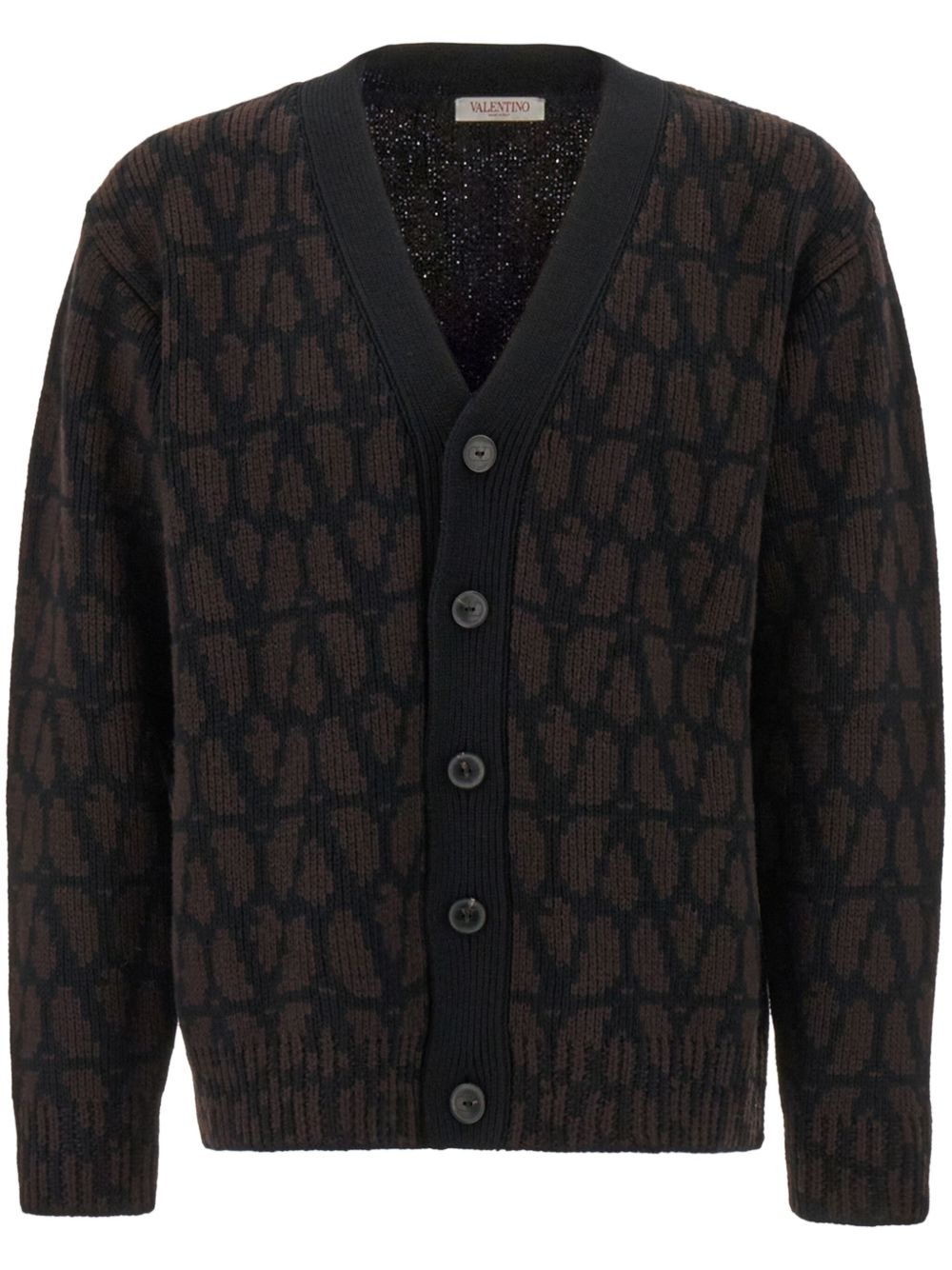 Toile Iconographe wool cardigan Valentino takes an uncharacteristically subtle approach to branding with this cotton cardigan as the classic V-neck silhouette is presented in a brown hue and enhanced by a contrasting jacquard logo motif throughout. Highlights - Brown/black - Cotton - All-over logo jacquard pattern - V-neck - Long sleeves - Front button fastening - Ribbed trims - Straight hem Made in Italy Composition Virgin Wool 100% SIZE & FIT Measurement CHEST 41.73 in(106 cm) SLEEVE LENGTH 31.49 in(80 cm) Shoulder Width 18.89 in(48 cm) Washing instructions Read Manufacturer Guidelines