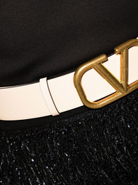 40mm VLogo Signature reversible belt Featuring the '70s-inspired VLogo Signature at the front, this belt conveys a sense of timeless elegance. Completed with gold-tone hardware, the leather-made reversible piece captures Valentino Garavani’s refined aesthetic. Highlights - Ivory white/rose pink - Calf leather - Vlogo signature - Antique-effect hardware - Punched holes - Adjustable fit - Reversible Made in Italy Composition Lining: Calf Leather 100% Outer: Metal 100%, Calf Leather 100% SIZE & FIT Measurement Minimum Length 33.46 in(85 cm) WIDTH 2.75 in(7 cm) TOTAL LENGTH 37.4 in(95 cm) Washing instructions Read Manufacturer Guidelines