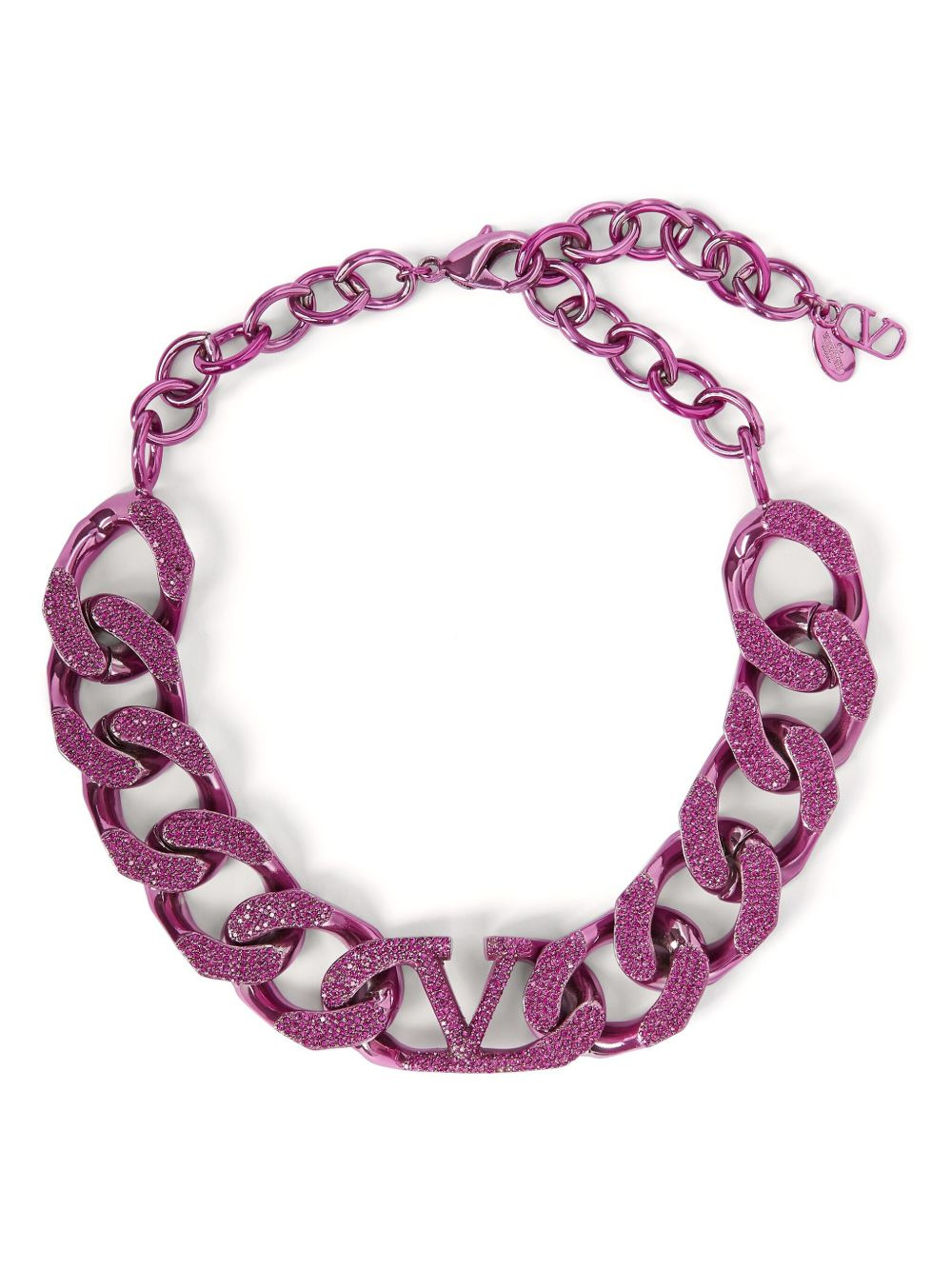 VLogo Signature curb-chain necklace A house icon since its debut at the Sala Bianca show in 1968, the VLogo Signature is displayed at the centre of this Valentino Garavani curb-chain necklace. Imagined in a glossy pink-tone metal, this piece features crystal embellishment all over for a striking look. Made in Italy SIZE & FIT Measurement WIDTH 0.74 in(1.9 cm) Length when open 15.55 in(39.5 cm) Washing instructions Read Manufacturer Guidelines