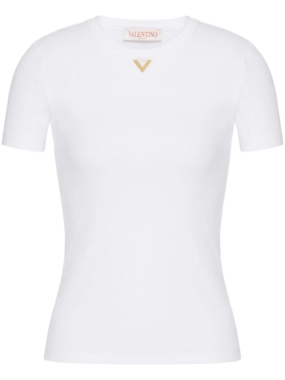 VGold ribbed cotton T-shirt Highlights - White - Cotton blend - Fine ribbed - Vgold detail - Cut-out detailing - Crew neck - Short sleeves - Straight hem - The model is 176 cm / 5'9'' tall and wears an italian size s Made in Italy Composition Cotton 98%, Spandex/Elastane 2% SIZE & FIT Measurement LENGTH 21.25 in(54 cm) Washing instructions Read Manufacturer Guidelines