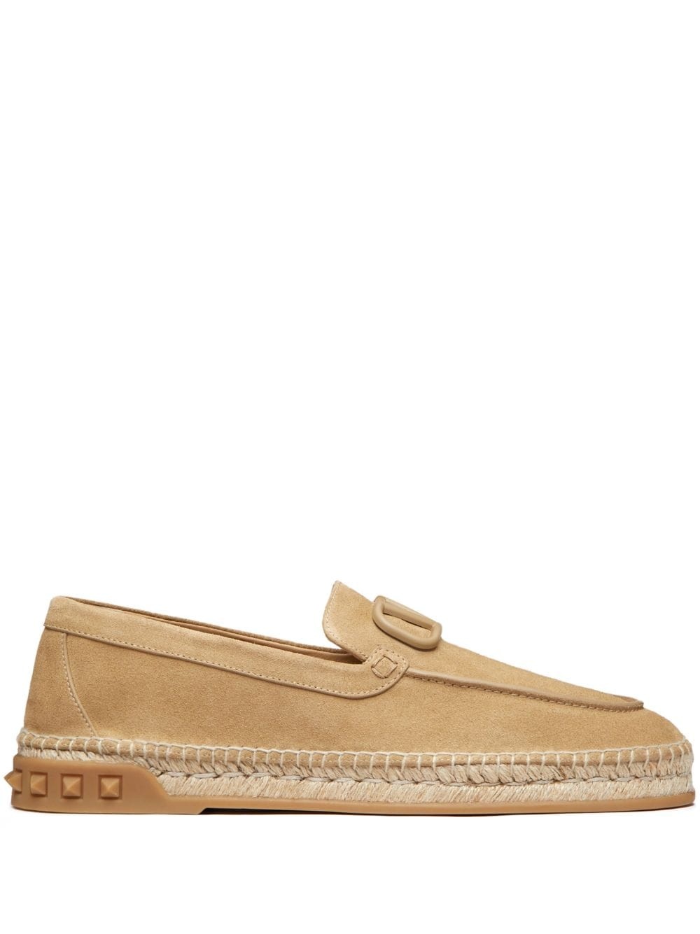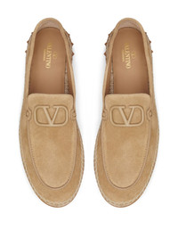 Leisure Flows suede espadrilles Valentino Garavani's renowned VLogo Signature was first seen in 1968 and has become a true icon of the Italian fashion house since then. Decorating these desert beige Leisure Flows espadrilles, the motif is imagined in a tonal hue for a polished finish. Highlights - Desert beige - Suede - Vlogo signature - Tonal design - Almond toe - Slip-on style - Braided raffia sole Made in Italy Composition Lining: Lamb Skin 100%, Goat Skin 100% Outer: Metal 100%, Calf Suede 100% Sole: Plastic 100% SIZE & FIT Measurement HEEL 1.18 in(3 cm) Sole height 0.98 in(2.5 cm) Washing instructions Read Manufacturer Guidelines