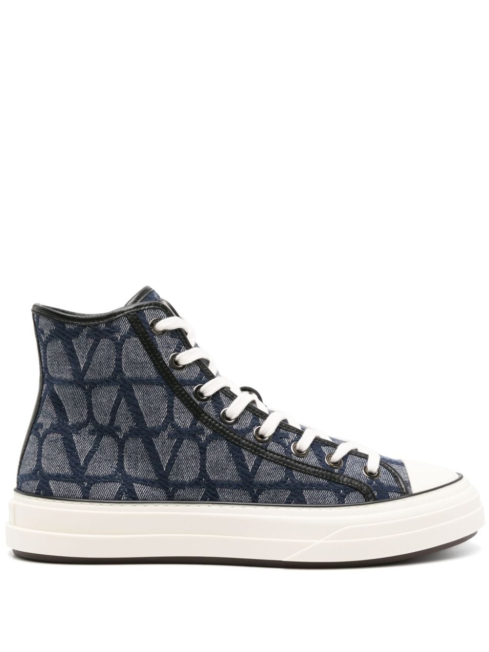 VLogo Signature high-top sneakers Valentino Garavani saturates these high-top sneakers with its iconic VLogo Signature motif. They're crafted from canvas and are finished with a contrasting rubber toe cap. Highlights - Indigo blue - Cotton - Vlogo signature - Monogram jacquard - Logo patch at the tongue - Debossed logo to the rear - Round toe - Front lace-up fastening - Branded insole - Flat rubber sole - This piece comes complete with a protective dust bag. Made in Italy Composition Sole: Rubber 100% Outer: Cotton 100% Lining: Fabric 100% SIZE & FIT Measurement HEEL 1.57 in(4 cm) HEIGHT 4.52 in(11.5 cm)