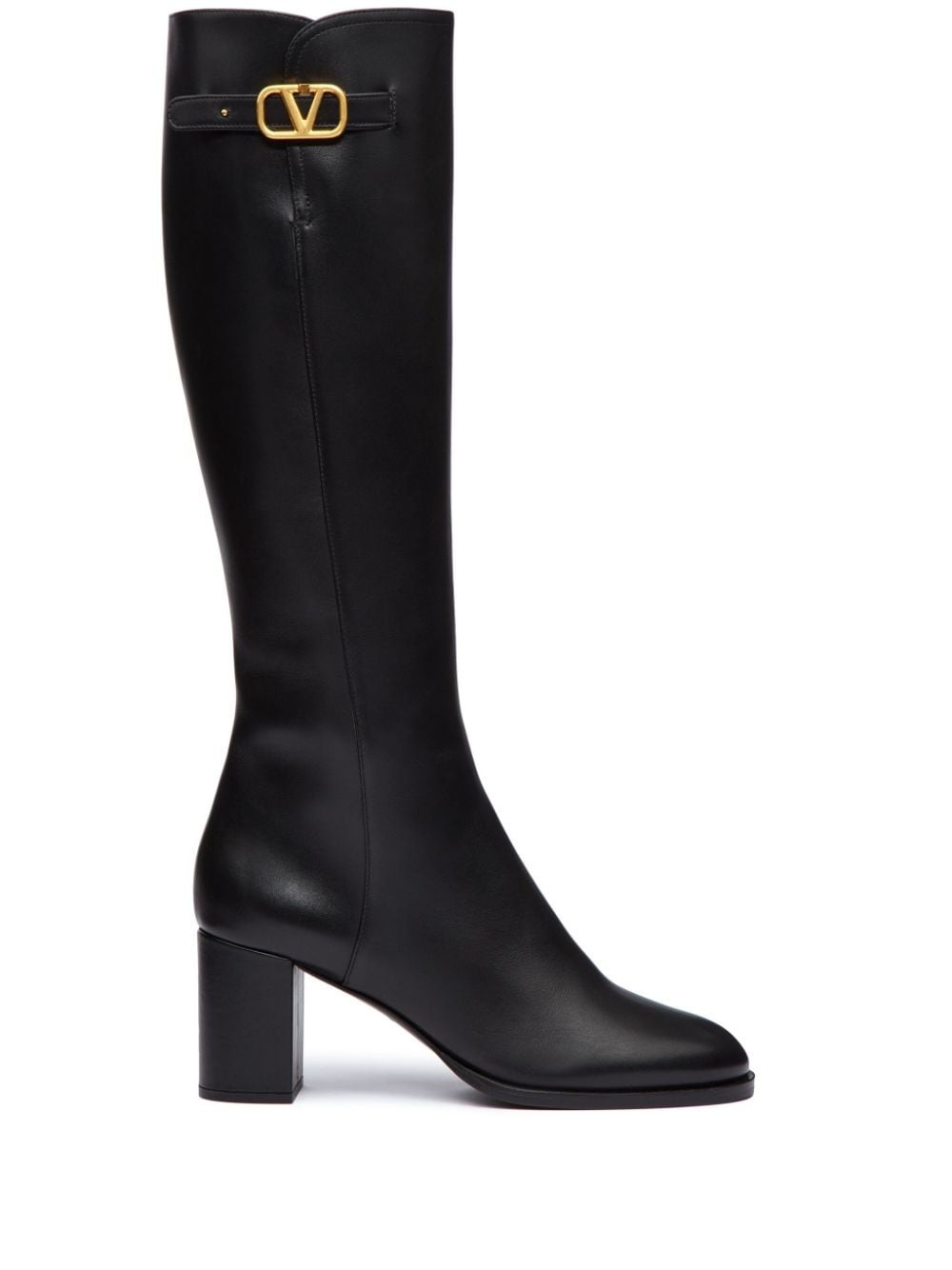 70mm VLogo Signature boots Sitting atop a high block heel, these black knee-high boots are expertly crafted from supple calf leather in Italy and emblazoned with a Vlogo Signature plaque at the side – one of Valentino Garavani's most celebrated motifs. Highlights - Black tie collection - Black - Calf leather - Knee-high - Almond toe - Vlogo signature - Side zip fastening - High block heel Made in Italy Composition Outer: CALFSKIN 100%, Metal 100% Sole: Calf Leather 50%, Plastic 50% Lining: Lambskin 100%, Goat Skin 100% Washing instructions Read Manufacturer Guidelines