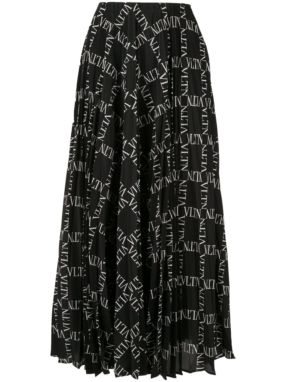 VLTN print skirt Capture the essence of Italian luxury and glamour with the latest Valentino collection and this black silk VLTN print skirt. Featuring a high waist, a pleated skirt and an all over logo print. Made in Italy Composition Silk 100% SIZE & FIT Model measurements Height 5 ft 10 in(1.79 m) Bust/Chest 31.49 in(80 cm) Hips 35.03 in(89 cm) Waist 25.19 in(64 cm)