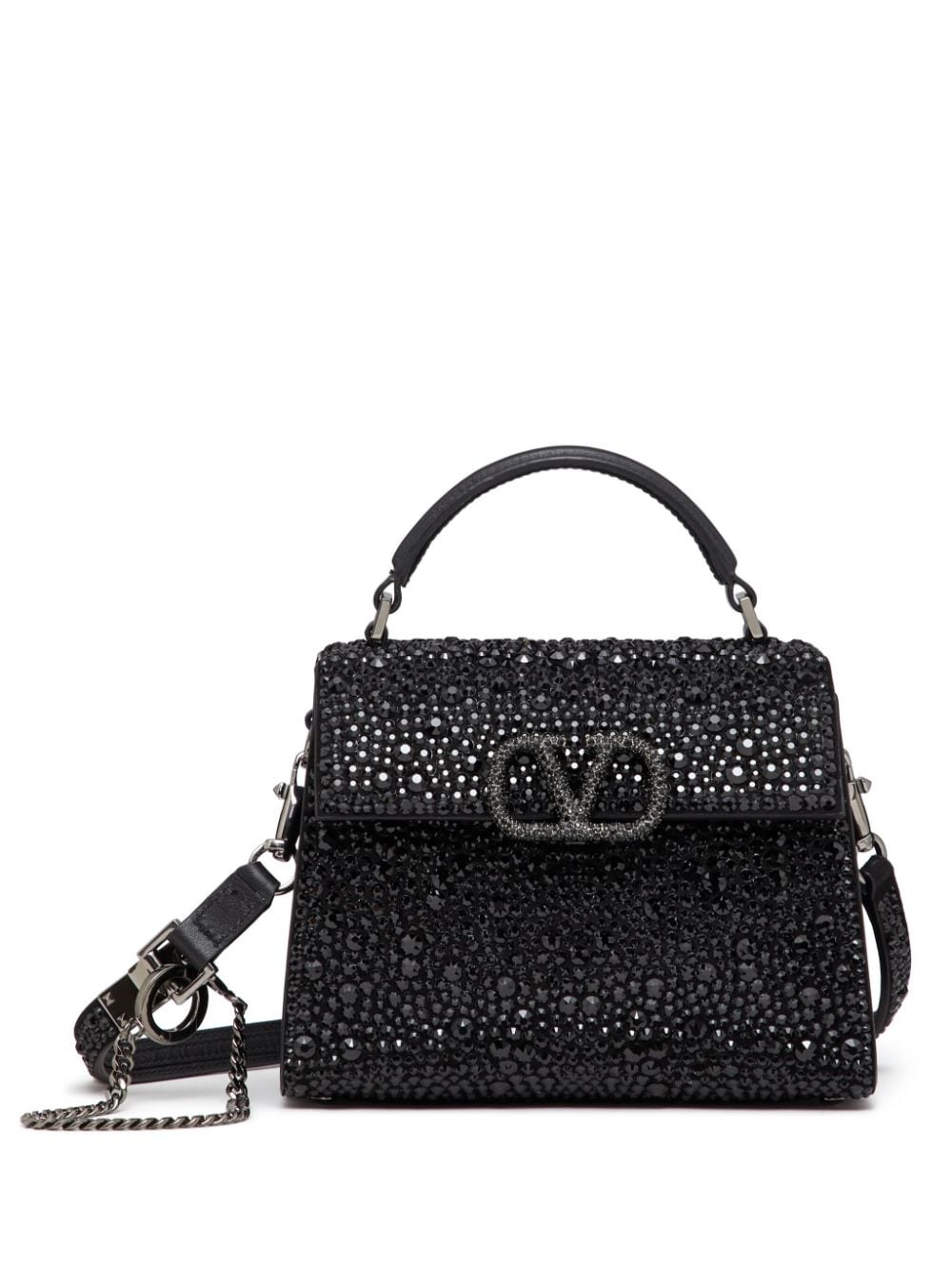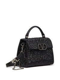 VSling crystal-embellished mini bag Encapsulating Valentino Garavani's refined elegance, the VSling tote bag is defined by the shimmering crystal embellishment throughout. Crafted with a structured trapeze silhouette, the calf-leather accessory features a tonal VLogo Signature to its front. Highlights - Black tie collection - Black - Lambskin - Crystal embellishment - Vlogo signature - Single top handle - Detachable shoulder strap - Foldover top with magnetic fastening - Main compartment - Metal feet Made in Italy Composition Lining: Lambskin 100%, Calf Leather 100% Outer: glass 100%, Calf Leather 100%, Lambskin 100%, Metal 100% SIZE & FIT Measurement DEPTH 3.93 in(10 cm) HEIGHT 5.11 in(13 cm) WIDTH 7.48 in(19 cm) Washing instructions Read Manufacturer Guidelines