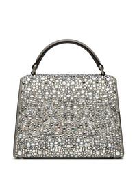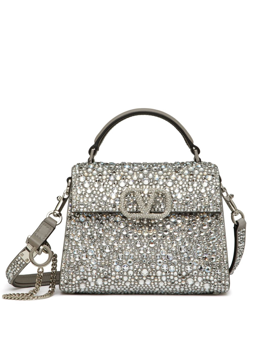 VSling crystal-embellished mini bag Covered in glistening glass crystals for an eye-catching finish, this mini tote from Valentino Garavani is crafted from smooth calf leather in Italy and boasts a recognisable Vlogo motif at the centre, specially adorned with Swarovski crystals. Its adjustable strap allows it to be worn across the body, on the shoulder or handheld. Highlights - Black tie collection - Silver-tone - Lambskin - Palladium-plated hardware - Glass crystal embellishment - Swarovski crystal-embellished vlogo signature - Foldover top with magnetic fastening - Main compartment - Internal logo patch - Internal slip pocket - Single circular top handle - Adjustable detachable shoulder strap Made in Italy Composition Outer: Lambskin 100%, glass 100%, Metal 100% Lining: Lambskin 100% SIZE & FIT Measurement DEPTH 3.93 in(10 cm) HEIGHT 5.11 in(13 cm) WIDTH 7.48 in(19 cm)