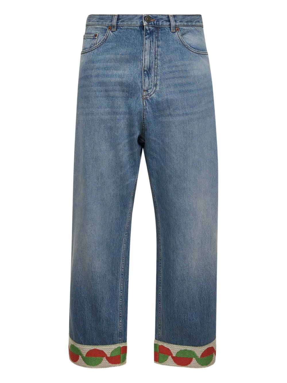 jacquard-hem jeans Highlights - Light blue - Front button and zip fastening - Classic five pockets - Belt loops - Embroidered detailing Made in Italy Composition Outer: Leather 100%, Cotton 100% Lining: Polyester 65%, Cotton 35%