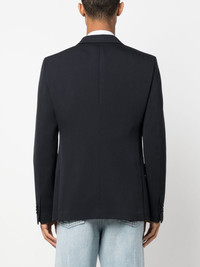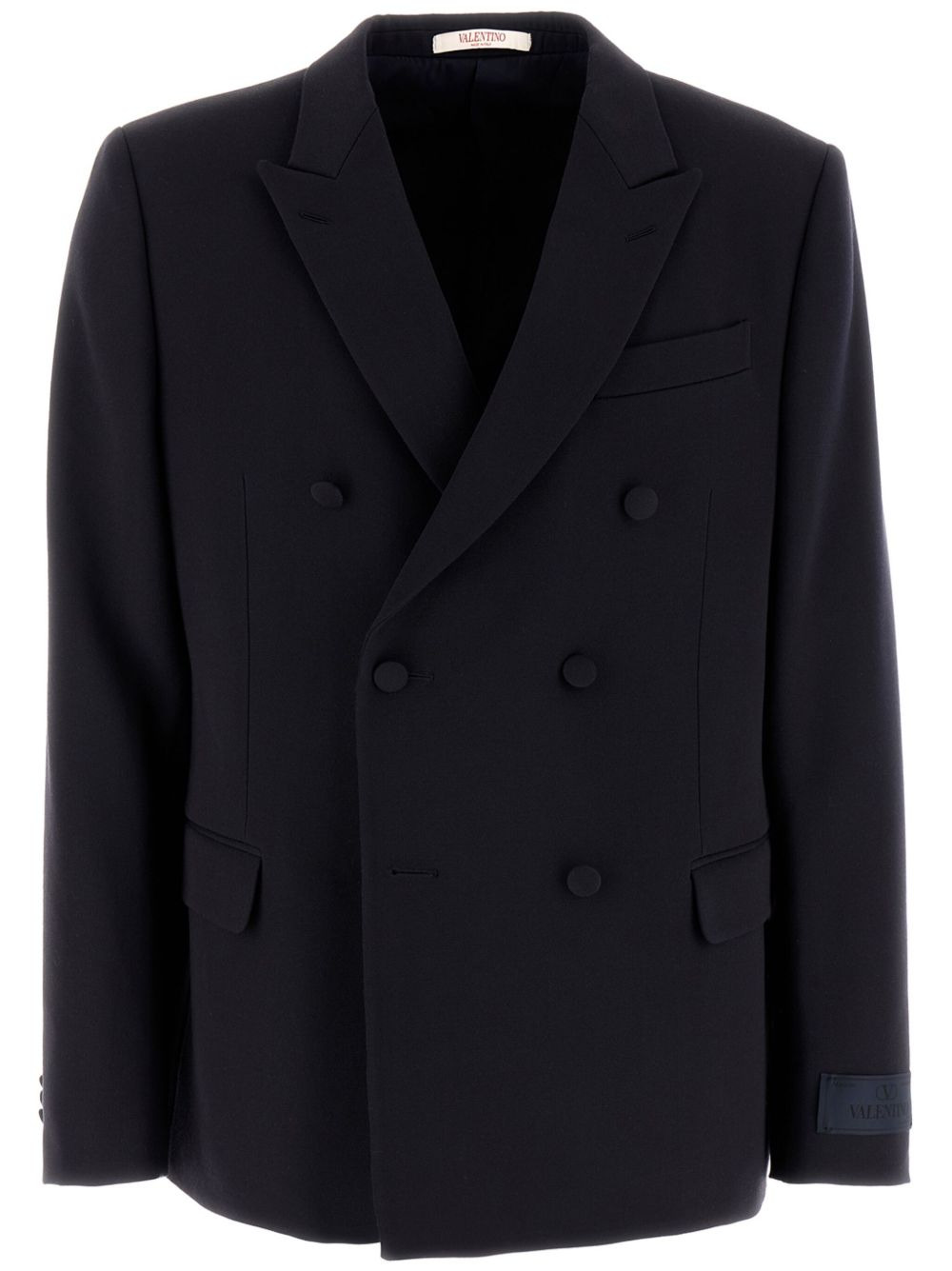 wool double-breasted blazer This blazer by Valentino Garavani finely demonstrates its exquisite Italian craftsmanship. Crafted from wool, it's cut to a double-breasted silhouette with refined peak lapels. Highlights - Navy blue - Wool - Peak lapels - Double-breasted button fastening - Long sleeves - Chest welt pocket - Front flap pockets Made in Italy Composition Lining: Cupro 100%, Polyamide 57%, Cotton 43% Outer: Wool 63%, Viscose 37% SIZE & FIT FittingInformation Designed for a slim fit, offering a comfortable fit that sits just away from the body The vented hem offers movement at the rear Made from a midweight non-stretch fabric This piece fits true to size – take your usual size Washing instructions Read Manufacturer Guidelines