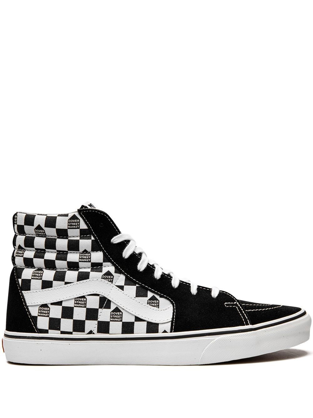x Dover Street Market Sk8-Hi "Check" sneakers Designed in partnership with Dover Street Market, these Vans Sk8-Hi sneakers are decorated with a checkerboard print with the retailer's logo on various squares. They're crafted from a mix of canvas and suede and sit atop a flat rubber sole. Imported Composition Suede 100%