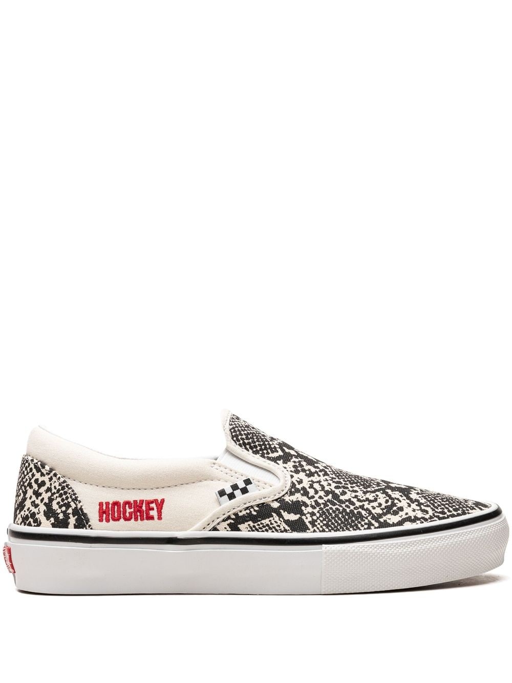 x Hockey Skate Slip-On "Snakeskin" sneakers Vans and Hockey join forces once again to launch a bold, rebellious collection, as shown in the Skate Slip-On sneakers. The snakeskin-print upper with red block letter embroidery speaks to Hockey's raw, no-holds-barred approach, which combines with proprietary Vans technology to create a skate-minded design. The POPCUSH™ cushioned footbed's impact absorption and energy return protect the foot, lessening fatigue, while the SickStick™ gum rubber compound provides maximum grip. Highlights - White/black - Snakeskin print - Embroidered motif - Logo at the sole - Round toe - Slip-on style - Rubber outsole - These styles are supplied by a premium sneaker marketplace. stocking only the most sought-after footwear, they source and curate some of the most hard to find sneakers from around the world. Imported Composition Sole: Rubber 100% Outer: Fabric 100% Lining: Fabric 100%