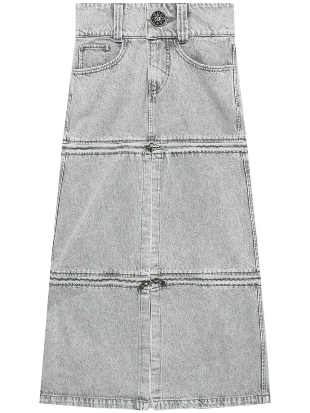 denim midi skirt Highlights - Grey - Cotton - Denim - Washed denim - Decorative zip detailing - Logo patch to the rear - Belt loops - Classic five pockets - Concealed front fastening - Front slit - Straight hem - Mid-length Imported Composition Cotton 100%