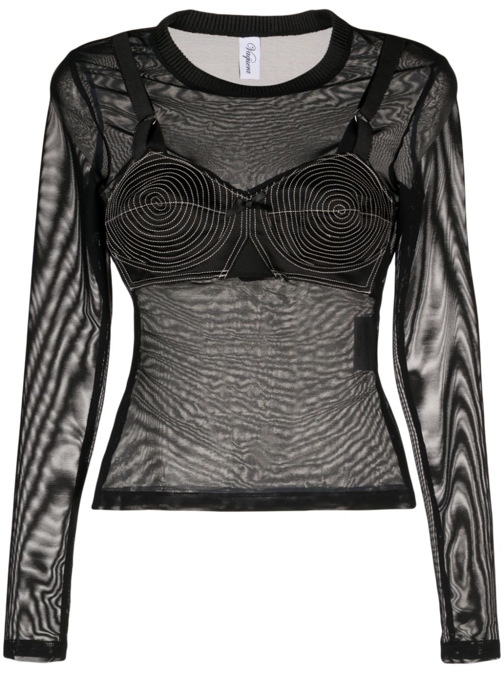 mesh long-sleeved top NYC-based brand Vaquera showcases its bold aesthetic with this black mesh top. The mesh construction is topped with a bullet bra for a daring twist. Highlights - Black - Mesh design - Layered design - Bullet bra - Round neck - Long sleeves Made in United States Composition Cotton 100% SIZE & FIT Model measurements Height 5 ft 10 in(1.77 m) Bust/Chest 31.49 in(80 cm) Hips 35.43 in(90 cm) Waist 25.19 in(64 cm) FittingInformation Designed for a very close and sculpting fit The moulded cups offer shape and support Made from a midweight non-stretch fabric, this piece offers minimal elasticity when worn This piece fits true to size – those with a fuller chest may wish to take one size up
