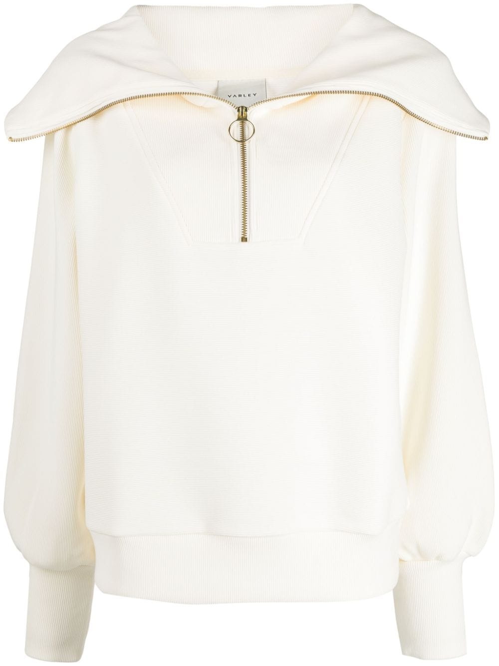 SW Vine half zip sweater Highlights - Ivory white - Stretch-cotton - Fine ribbed - Jersey texture - High neck - Half front zip fastening - Gold-tone hardware - Long sleeves - Balloon sleeves - Fitted-cuff sleeves - Elasticated waistband Made in United Kingdom Composition Outer: Cotton 53% Polyester 46%, Elastane 1% Washing instructions Machine Wash