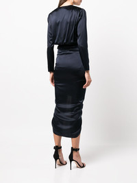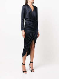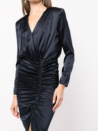 Cameri ruched long-sleeve midi dress navy blue silk blend ruched bodice V-neck long sleeves asymmetric hem Imported Composition Silk 92%, Elastane 8% SIZE & FIT Model measurements Height 5 ft 10 in(1.77 m) Bust/Chest 33.85 in(86 cm) Hips 35.03 in(89 cm) Waist 24.01 in(61 cm) Measurement WAIST 27.16 in(69 cm) HIPS 31.1 in(79 cm) FittingInformation This piece fits large – you might want to get one size down Designed for a close fit at the bust, waist and hips Made with a lightweight fabric