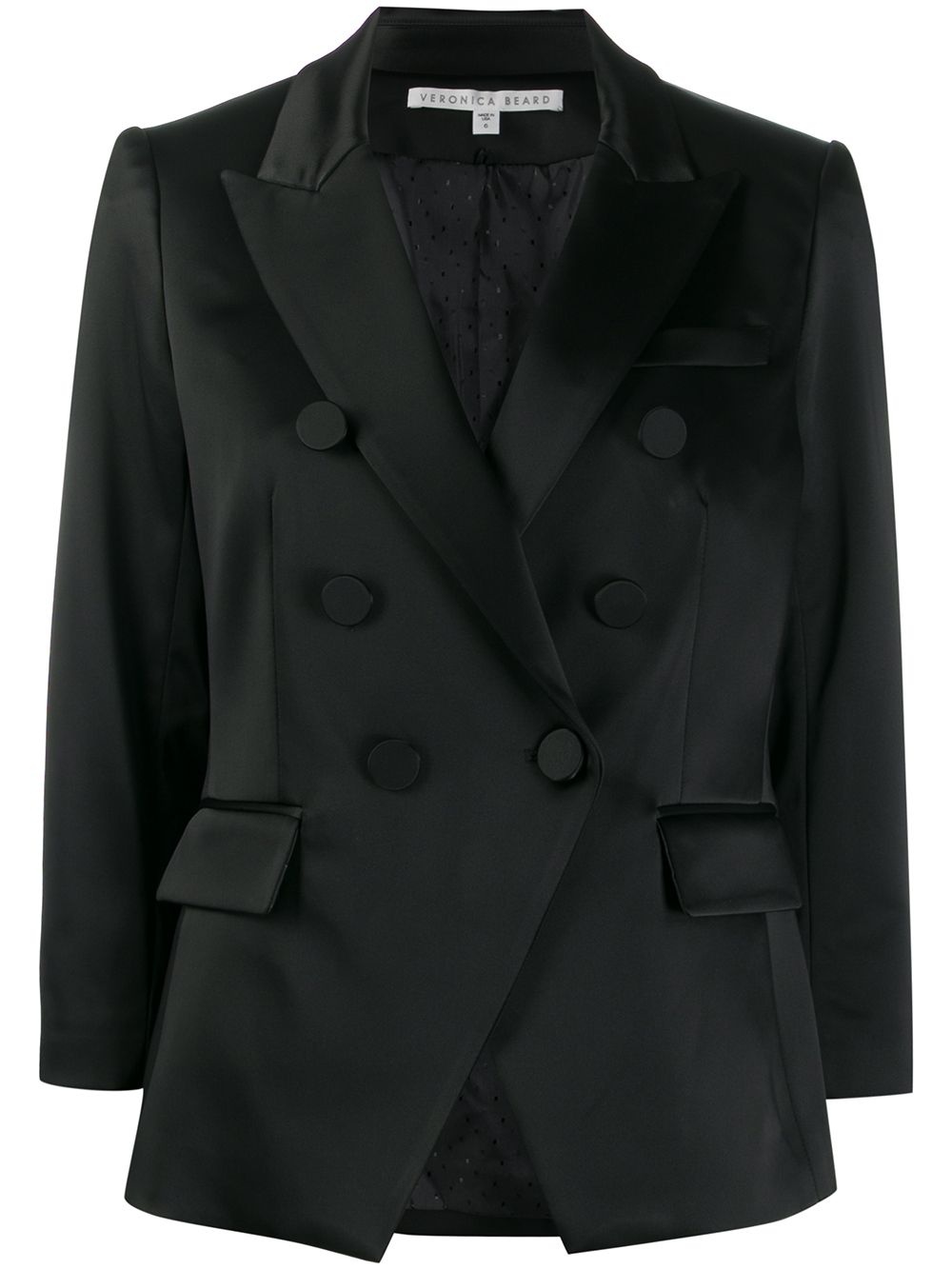 double breasted blazer Black double breasted blazer from Veronica Beard featuring peaked lapels, a double breasted front fastening, front flap pockets, a fitted silhouette, long sleeves, button cuffs and a rear central vent. Made in United States Composition Outer: Acetate 48%, Polyamide 45%, other fibers 7% Lining: Polyester 100% SIZE & FIT Model measurements Height 5 ft 9 in(1.74 m) Bust/Chest 32.28 in(82 cm) Hips 35.82 in(91 cm) Waist 24.01 in(61 cm) FittingInformation This piece fits true to size. We recommend you get your regular size Cut for a slim fit Made with a mid-weight non-stretch fabric Washing instructions Dry Clean Only