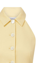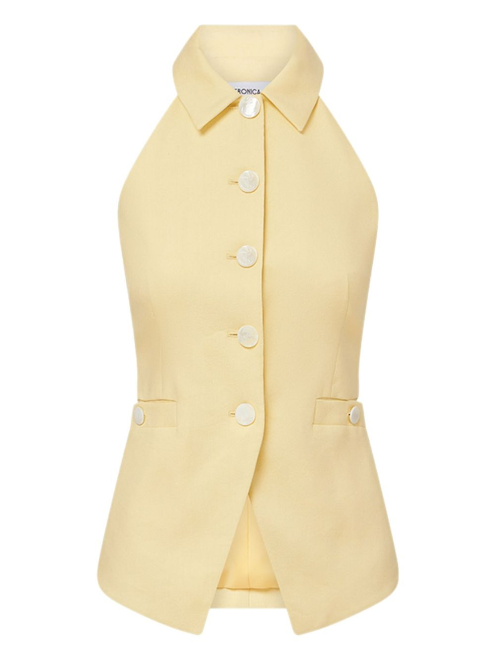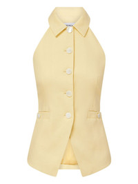 halterneck buttoned vest Highlights - Pale yellow - Halterneck - Button front - Classic collar - Welt pockets - Sleeveless Made in Italy Composition Outer: Linen/Flax 55%, Viscose 44%, Elastane 1% Lining: Polyester 100% Washing instructions Dry Clean Only