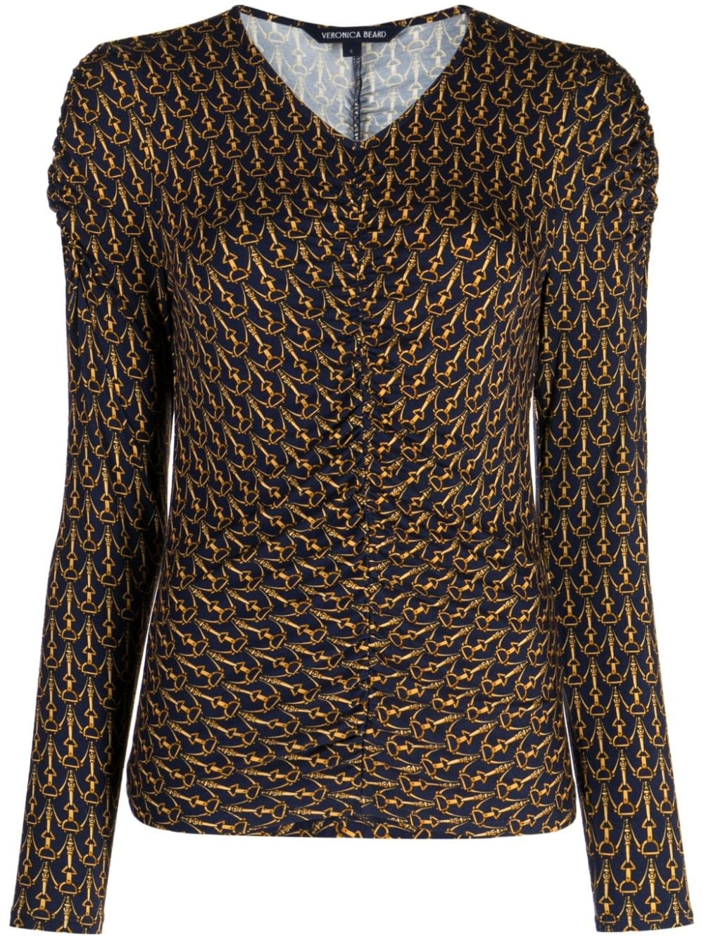Neeta monogram top Highlights - Navy blue/multicolour - Monogram pattern - Ruched detailing - V-neck - Long sleeves - Straight hem Imported Composition Rayon 95%, Spandex/Elastane 5% Washing instructions Machine Wash