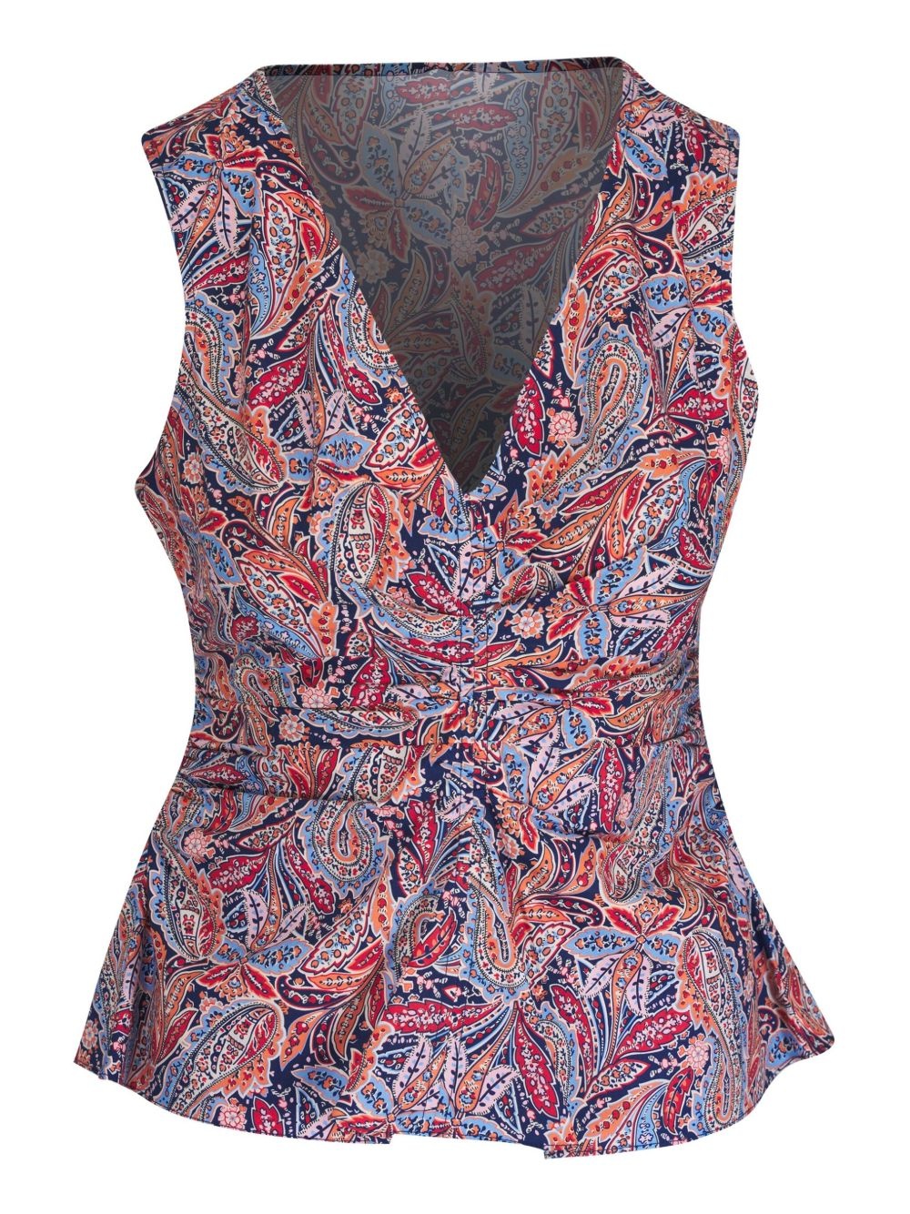 paisley-print peplum top Highlights - Multicoloured - V-neck - Sleeveless - Gathered front detail - Peplum hem - Back fastening Made in United States Composition Cotton 98%, Elastane 2%