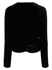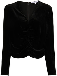 Pelona velvet blouse Highlights - Black - Silk blend - Velvet - Ruched bodice - V-neck - Concealed rear zip fastening - Long sleeves - Curved hem Made in United States Composition Rayon 79%, Silk 18%, Spandex/Elastane 3% Washing instructions Dry Clean Only