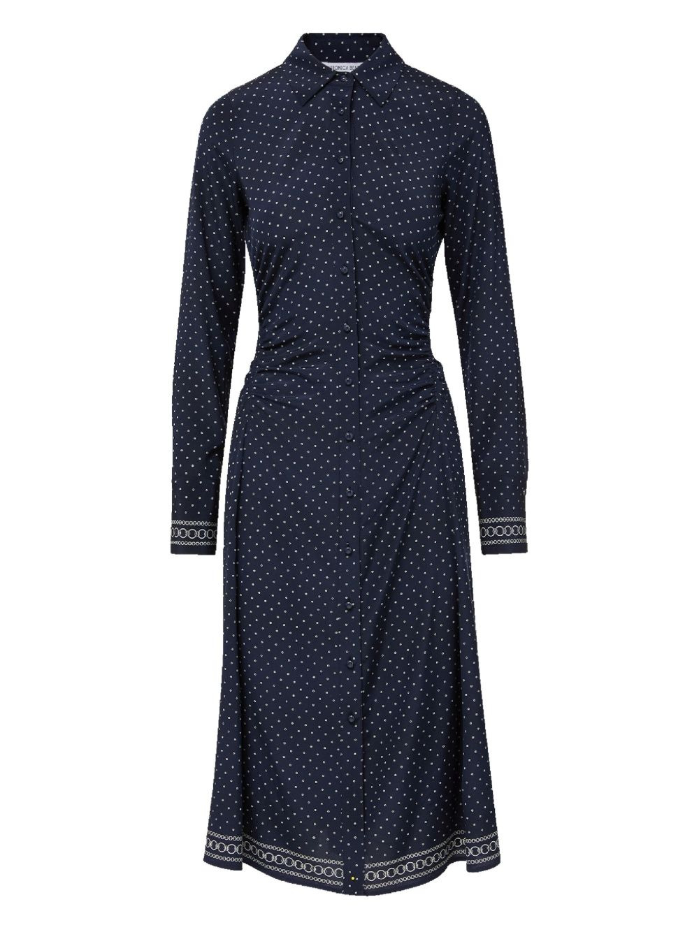 polka-dot print cinched-waist midi dress Highlights - Navy blue - Polka dot pattern - Cinched waist - Long sleeves - Button front Imported Composition Silk 93%, Spandex/Elastane 7% Washing instructions Read Manufacturer Guidelines