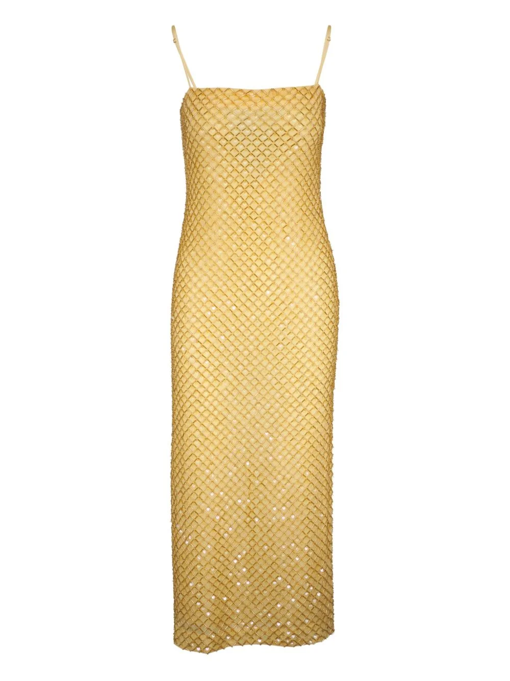 sequin-embellished midi dress Highlights - Yellow - Sequin embellishment - Spaghetti straps - Midi length - Side split - Straight neckline Made in United States Composition Polyester 100% Washing instructions Read Manufacturer Guidelines