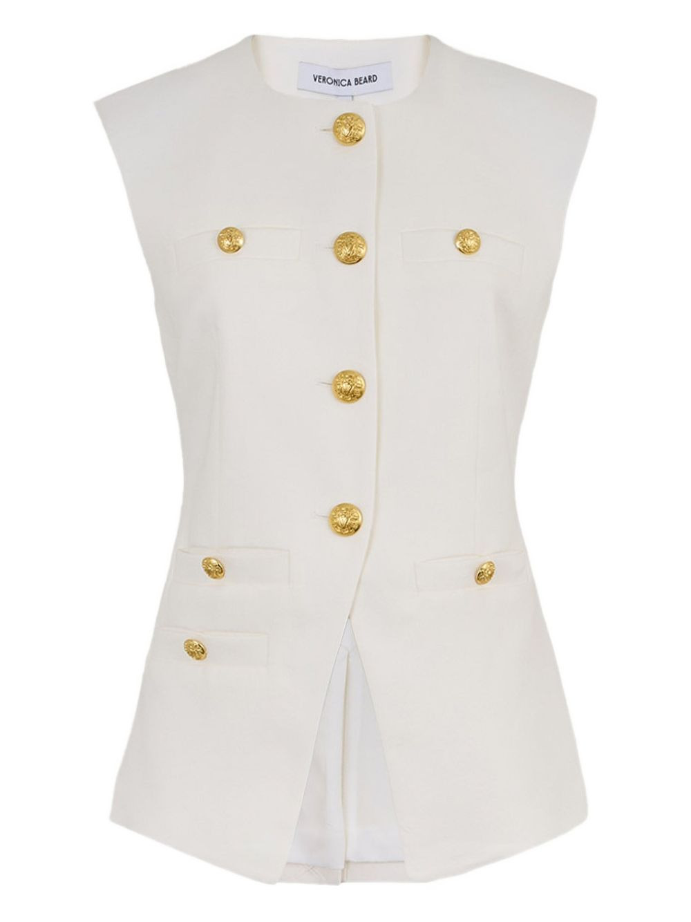 Tamara sleeveless waistcoat Highlights - Off-white - Sleeveless design - Gold-tone buttons - Welt pockets - Round neck - Straight hem Made in United States Composition Linen/Flax 53%, Polyester 29%, Viscose 16%, Elastane 2% Washing instructions Read Manufacturer Guidelines