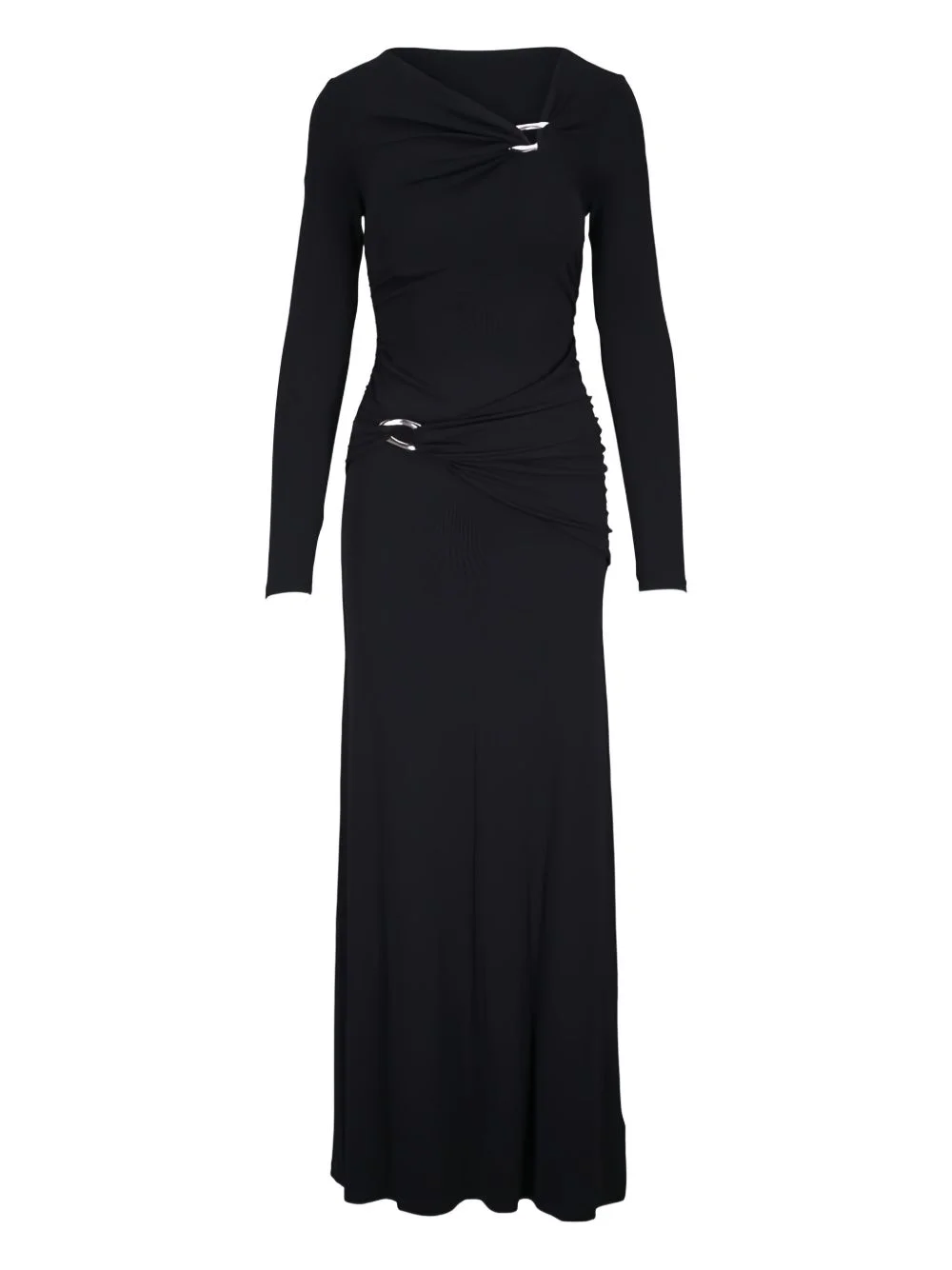 Viela long-sleeve ruched maxi dress Highlights - Black - Long-sleeve - Twist detail - Ruched detail - Floor length - Round neck Made in United States Composition Viscose 95%, Elastane 5% Washing instructions Read Manufacturer Guidelines