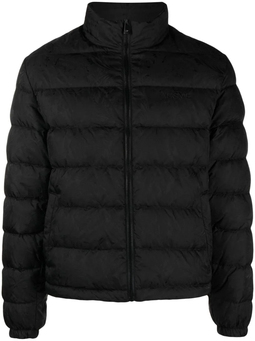 Barocco-print padded jacket Versace’s Barocco motif defined the eponymous founder’s formative era, and this black puffer jacket continues that legacy. It’s printed with the ornate graphic and quilted for even insulation. A funnel neck and drawstring hem help trap warmth. Highlights - Black - Shell - Goose down - Padded design - Quilted - Signature barocco print - Authenticity qr code - Logo-engraved silver-tone hardware - High neck - Front zip fastening - Long sleeves - Elasticated cuffs - Two press-stud fastening side pockets - Internal zip-fastening pocket - Full lining - Drawstring hem Imported Composition Outer: Polyamide 100% Lining: Polyester 100%, Duck Down 80%, Goose Down 20% SIZE & FIT Model measurements Height 6 ft 1 in(1.86 m) Bust/Chest 37.4 in(95 cm) Hips 36.22 in(92 cm) Waist 29.52 in(75 cm) Measurement CHEST 50.39 in(128 cm) SLEEVE LENGTH 27.16 in(69 cm) LENGTH 26.37 in(67 cm) WAIST 50.39 in(128 cm) FittingInformation Designed for a relaxed fit, this piece allows for comfort and movement when worn The internal drawstring at the hem allows for fitted preferences Made from a padded non-stretch fabric, giving it no natural elasticity This piece fits true to size – take your usual size Washing instructions Machine Wash