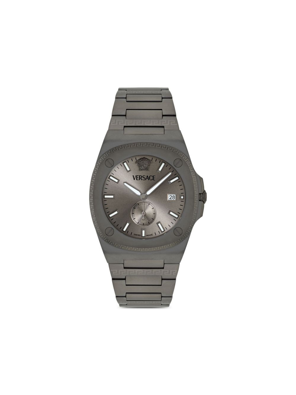 Antares Greek Key 40mm Highlights - Gunmetal grey dial - Stainless steel - Square case - 40 millimetre case size - Greek key bezel - Date window - Quartz movement - Screw-down crown - This item comes with a standard two-year warranty from the boutique. Imported Composition Sapphire Crystal 100%, stainless steel 100% SIZE & FIT Measurement DIAMETER 1.57 in(4 cm)